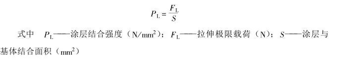涂層拉伸強(qiáng)度是涂層承受法線方向(垂直于涂層表面)拉伸應(yīng)力的極限能力,這是評(píng)定涂層結(jié)合力的最重要指標(biāo)。試驗(yàn)中,利用試驗(yàn)工具或設(shè)備使試樣承受垂直于涂層表面的拉伸力,直至試樣被拉開,即涂層剝離,記下破壞時(shí)的載荷,以試樣的斷面積除此載荷值,即可計(jì)算出涂層的拉伸強(qiáng)度。如下式: