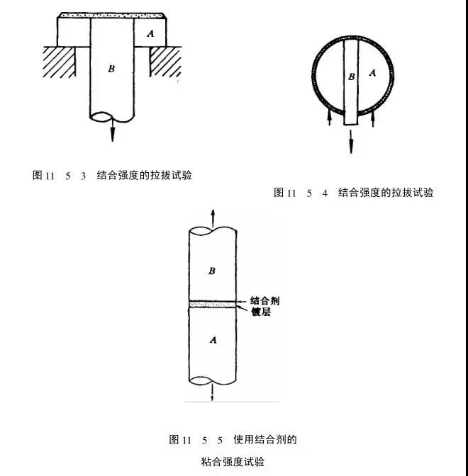 此外,對(duì)于軸類等圓柱形噴涂件,可如圖11_5_4所示,在圓柱形試件A上開孔,使活塞g通過,并使活塞的上表面曲率與圓柱試件的曲率相同,形成同一曲面后進(jìn)行噴涂,然后從下面支撐住圓柱試件,垂直向下拉拔活塞B,直至活塞上表面涂層被破壞,測(cè)出受力,再根據(jù)活塞斷面積,即可計(jì)算出涂層的結(jié)合強(qiáng)度。