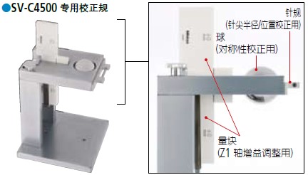 SV-C4500 系列使用專業(yè)校正規(guī)(標(biāo)配附件),東京精密粗糙度儀官網(wǎng),通過改進(jìn)使得上下兩方附帶從動件的上下圓錐測針能簡便易行地進(jìn)行校正。Z1 軸增益、對稱性、探針半徑等繁瑣的校正工作一次便可完成。